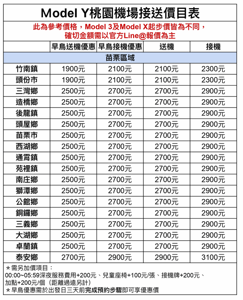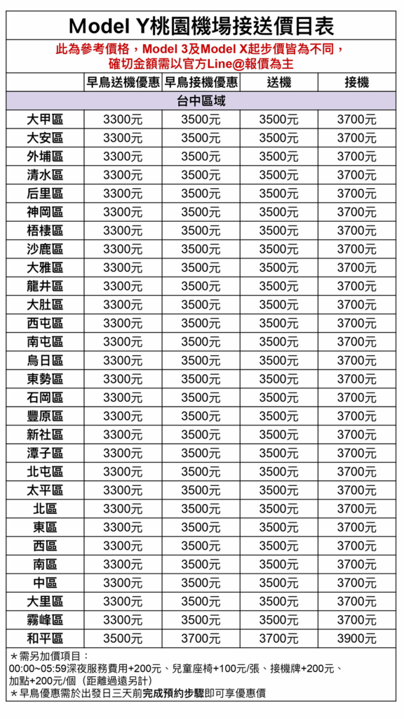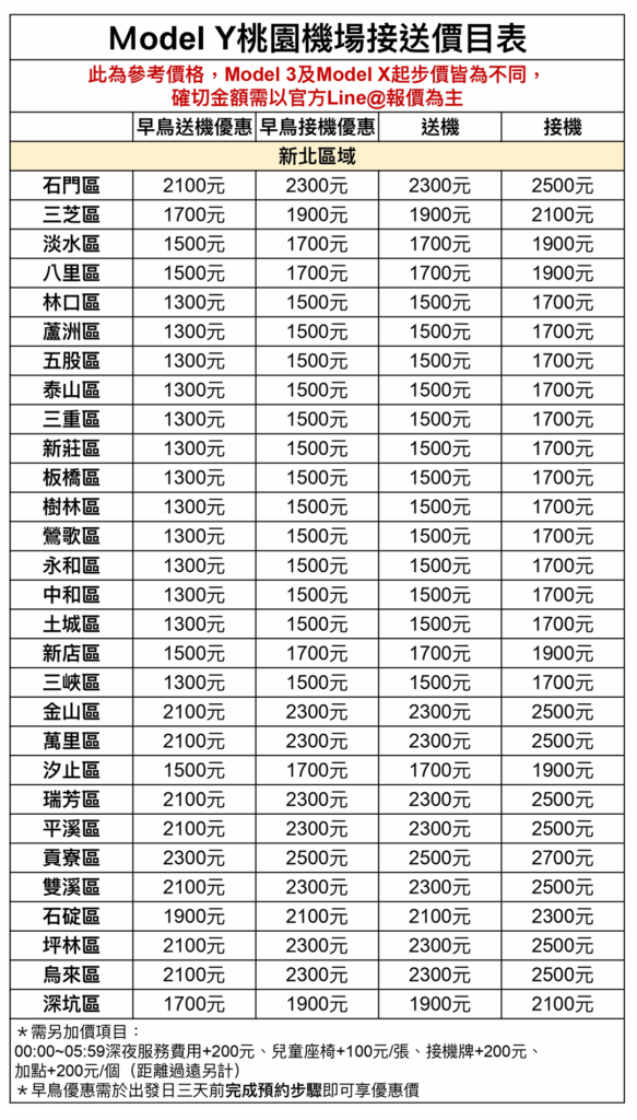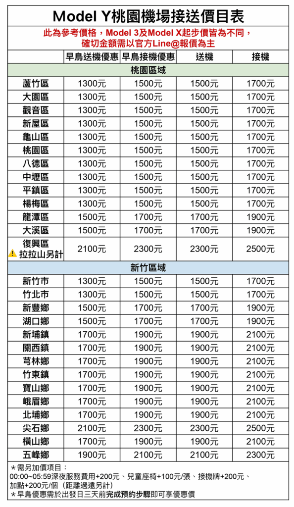Model Y 輕休旅五人座 商務出行 伴侶出遊 乘客至多4人,搭配至多3個29吋內的行李箱。經濟實惠,是機場接送首選車款。 Model Y 桃園機場接送價目表 基隆 台北區 新北區 桃園 新竹區 苗栗區 台中區 業界首創24小時AI預約 24th 智能預約
